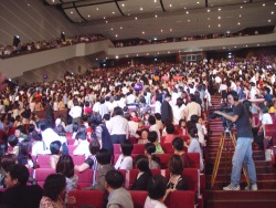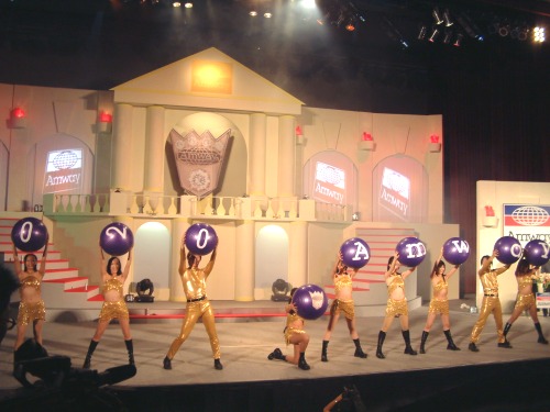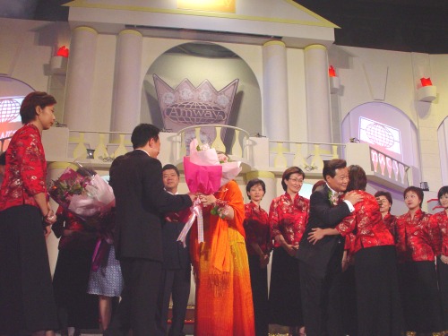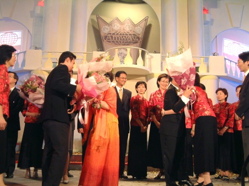 精彩的深情分享感言後,接下來的活動更將全場代入高潮,由9顆代表Amway 2002 及1顆代表「安麗皇冠大使PIN」大球,經由直銷商同心協力下傳到舞台前第一排,再由舞者接手,象徵新科皇冠大使帶領下線一同贏向頂峰。