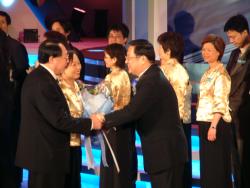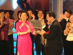 全場熱烈歡迎新科皇冠大使的出場並由皇冠大使下線代表獻花表達最真誠的祝福後,代表安麗頒發皇冠大使PIN及獎金參百萬元,進入表揚大會的主軸。