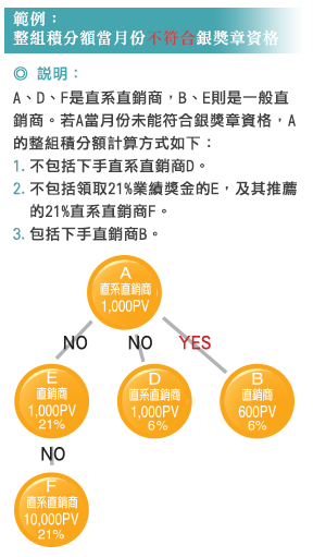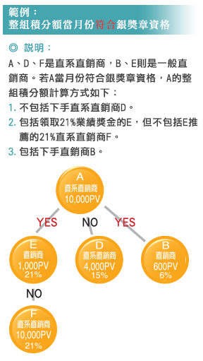 | 註一: | 整組積分額的定義為:每月小組積分額於個人當月份符合銀獎章資格時,可包含下手21%小組之業績;但若下手中有直系直銷商,則不論該下手直系直銷商是否達21%業績標準,其積分額皆需扣除之。 |