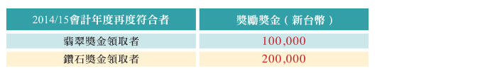 1. 於2014/15再度符合翡翠與鑽石獎金領取者資格。