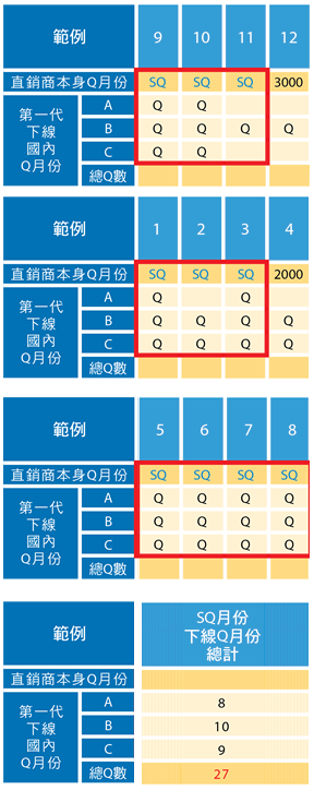 註二、SQ月份指個人及其所推薦的小組積分額達10,000分(含)以上,或個人推薦或代推薦一個(或以上)21%小組,且其小組積分額達4,000分。