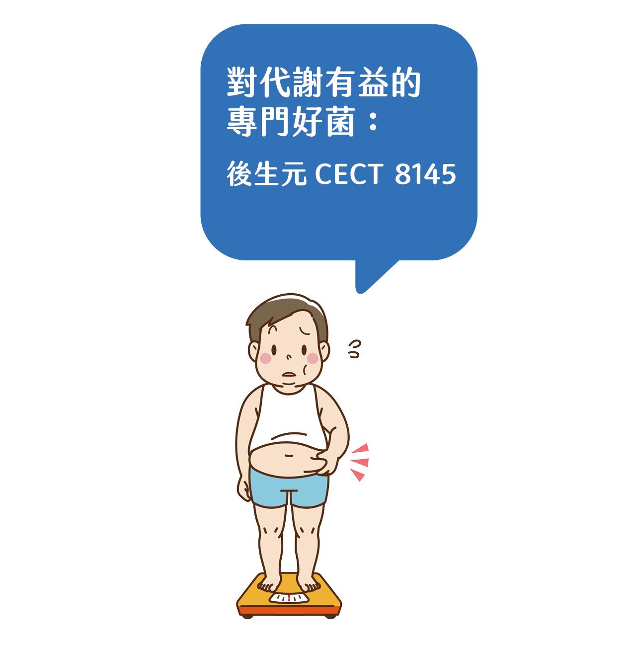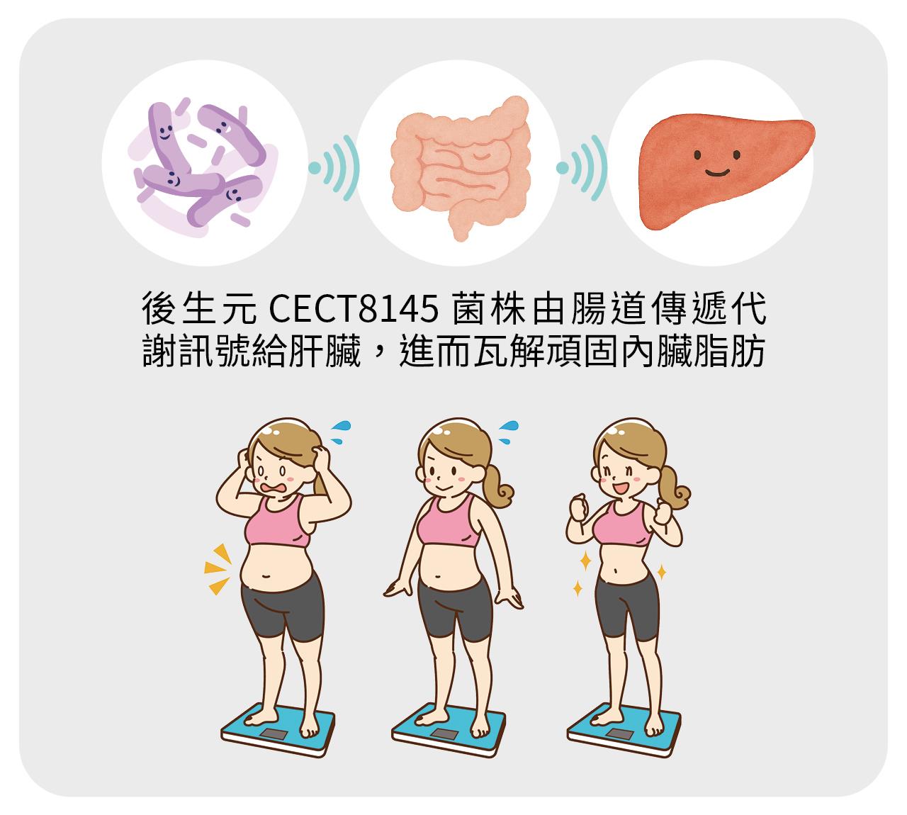 近期備受矚目的後生元,包含經過熱去活處理的益生菌、益生菌的碎片或是益生菌的有益代謝物等。臨床研究發現,代謝專門菌株CECT 8145,在菌株生長時的最佳時間點進行熱去活處理,成為後生元CECT8145,在進入腸道後會啟動一連串的連鎖反應,由腸道細胞傳遞代謝訊號給脂肪的指揮中心──肝臟,執行「減緩新脂肪生成(少囤積)、分解代謝既有脂肪(多分解)」的指令,進而瓦解惱人的內臟脂肪、減少腰圍,由內而外打造代謝順暢的體質,持久穩定地維持健康體態。