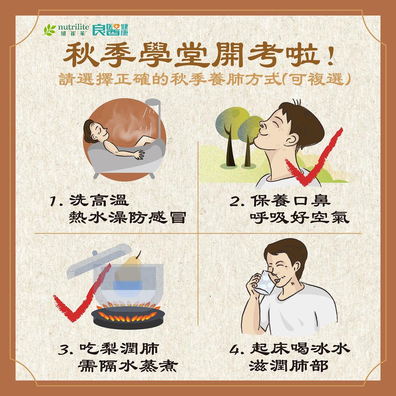 ◎ 特別提醒大家 : 秋季轉乾燥,為減少皮膚乾癢狀況,宜用溫水而不是高溫熱水洗澡;且起床後應服用常溫水,冰水反而易讓肺部和呼吸道組織血管收縮,導致肺功能下降喔!