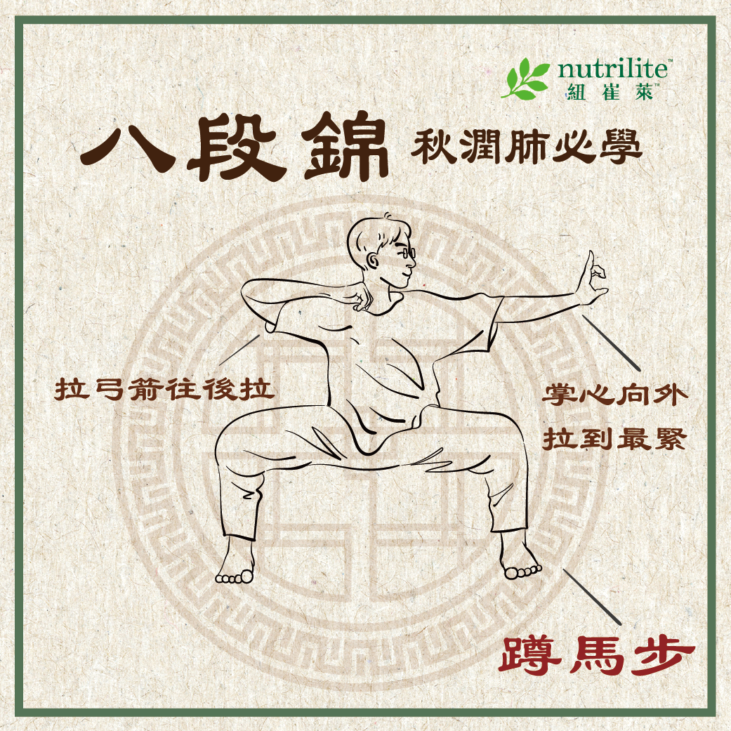 ① 蹲馬步,吸氣時一手掌心向外