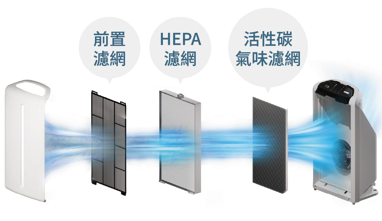 每個活性碳氣味濾網配備重達1,020克活性碳,吸附表面積達10.5個大巨蛋。可吸附異味及有害氣味分子,包括甲醛、戴奧辛等13種化學物質。