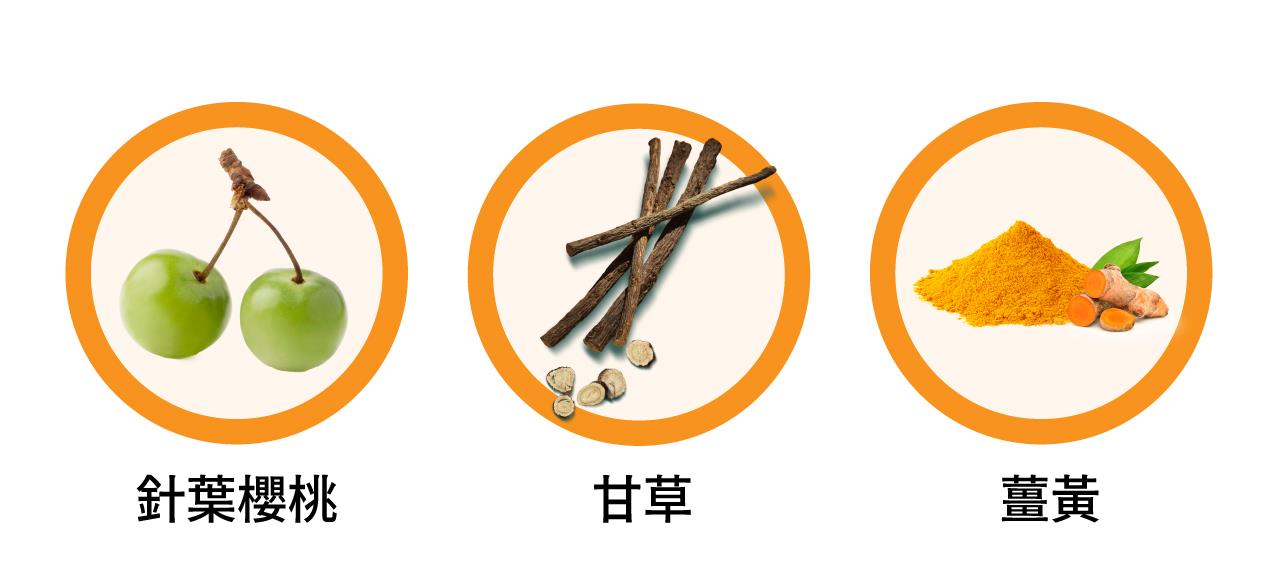 • 日常調養免疫力:針葉櫻桃、甘草、薑黃。經科學研究佐證,三者搭配能發揮加乘效果,有助於日常調養與體力維持,隨時食用,補充元氣。