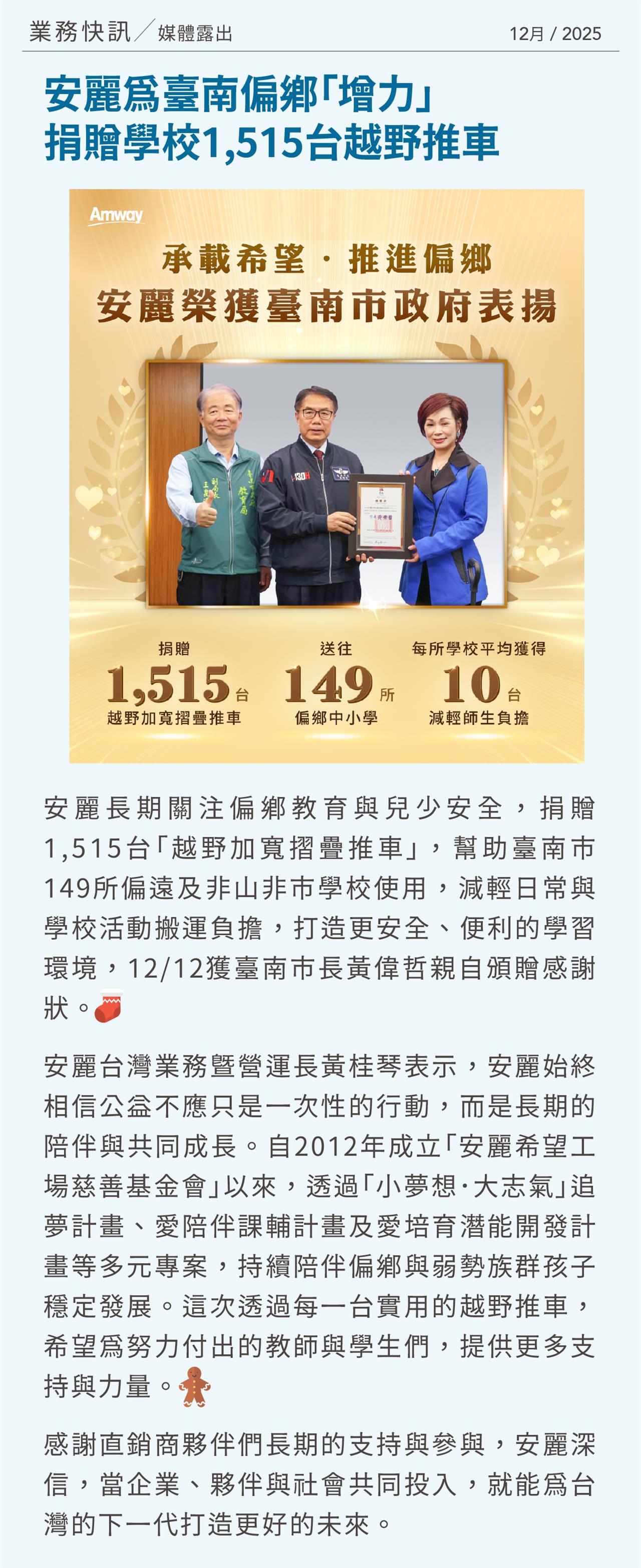 安麗為臺南偏鄉「增力」 捐贈學校1,515台越野推車