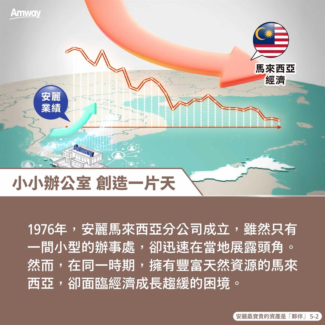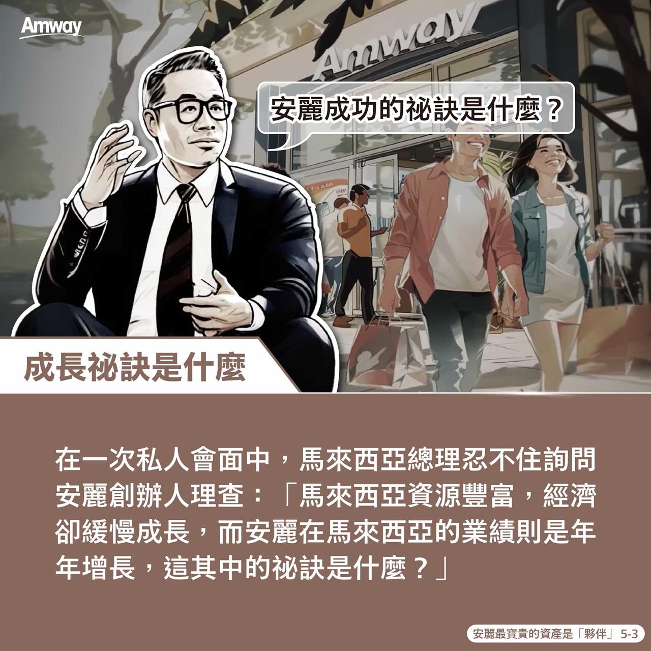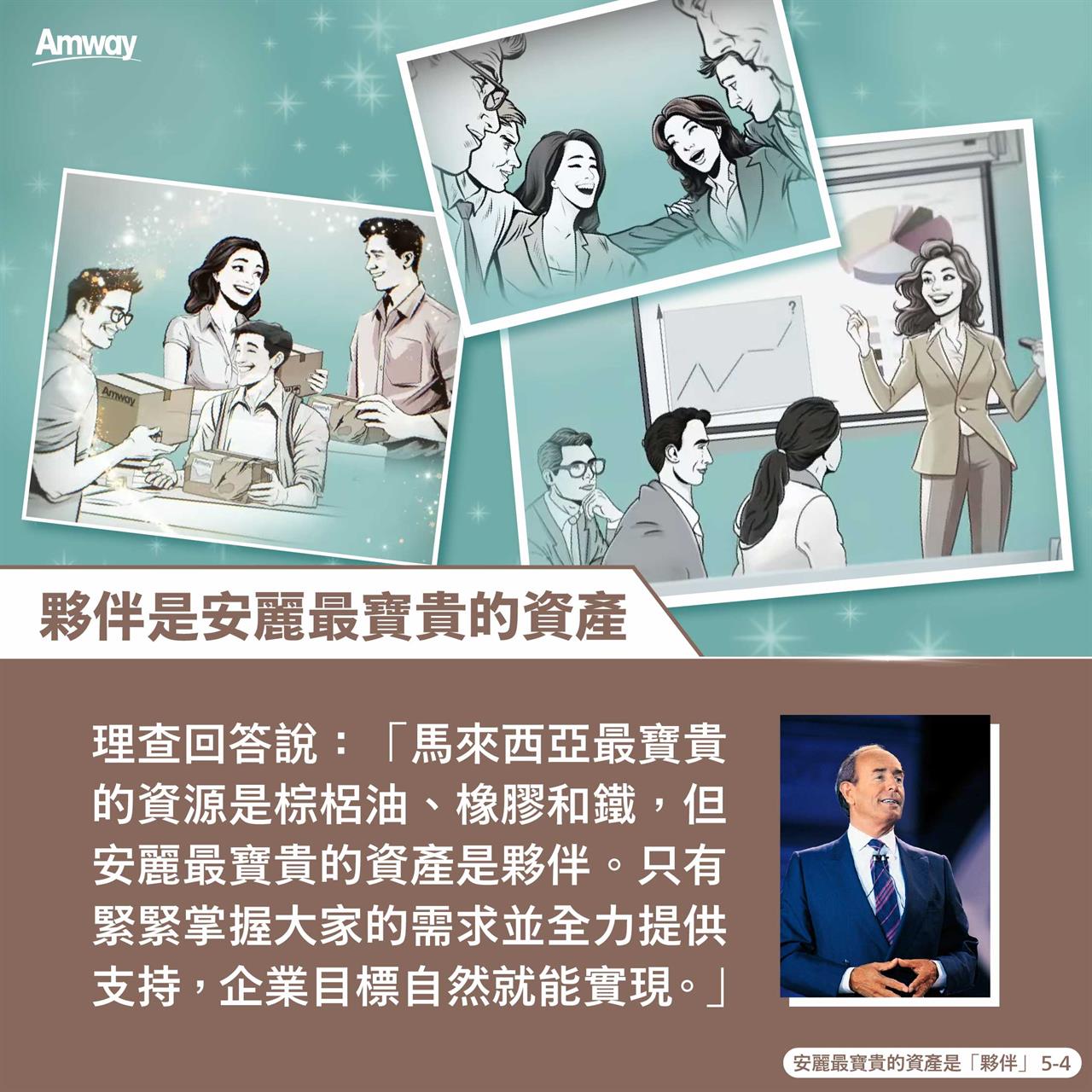 1976 年,安麗馬來西亞分公司在當地經濟低迷中逆勢成長。當時馬來西亞總理好奇詢問創辦人理查成功的祕訣,理查回答:「安麗最寶貴的資產是夥伴!只有掌握大家的需求並全力支持,企業目標自然能實現!」