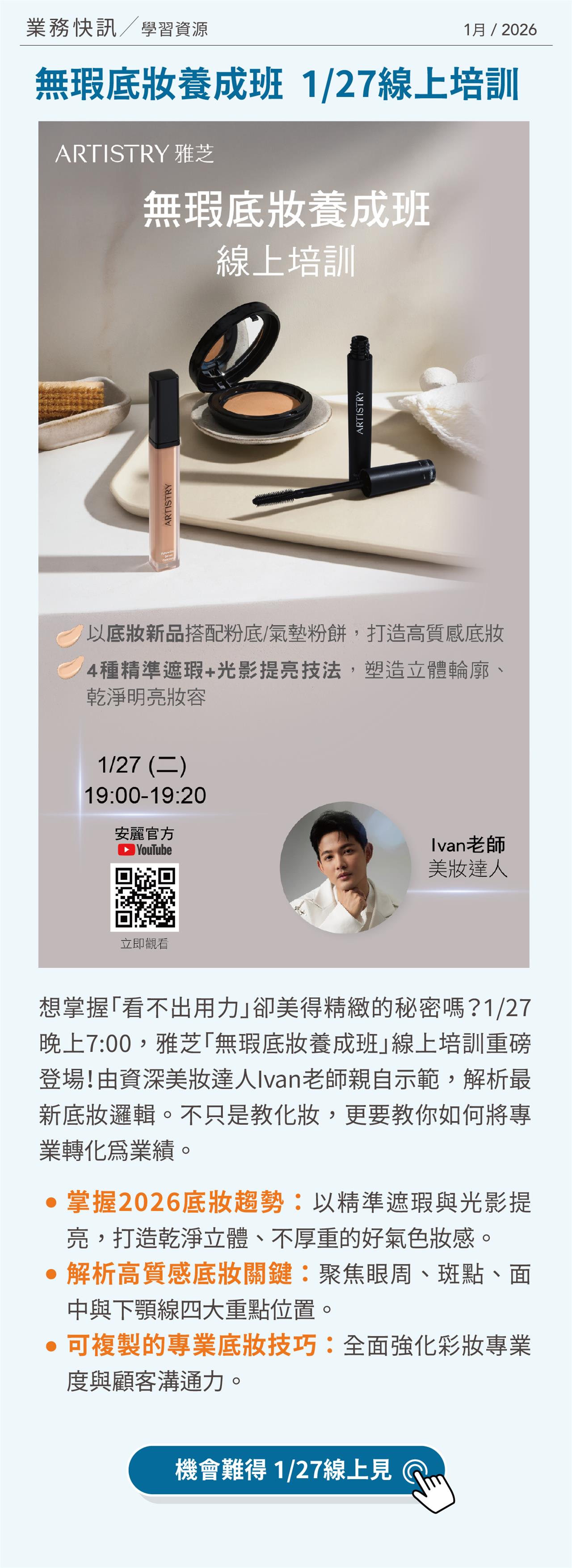 雅芝無瑕底妝養成班 1/27線上培訓