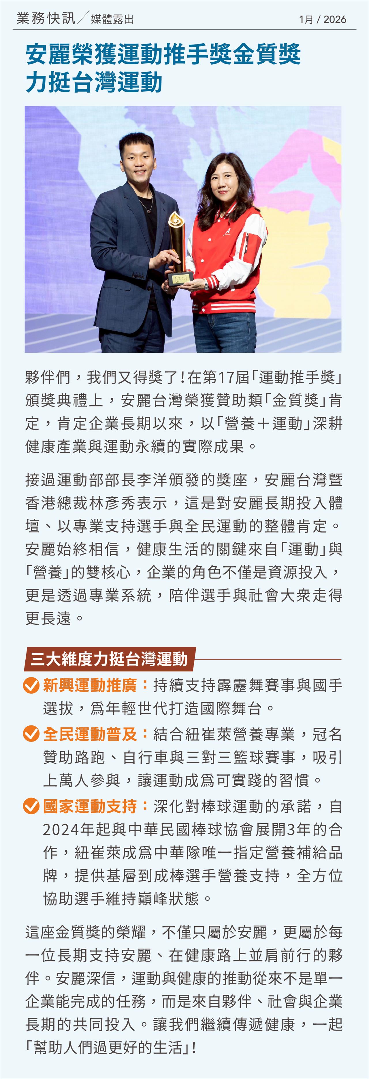 安麗榮獲運動推手獎金質獎 以「營養+運動」力挺台灣體育