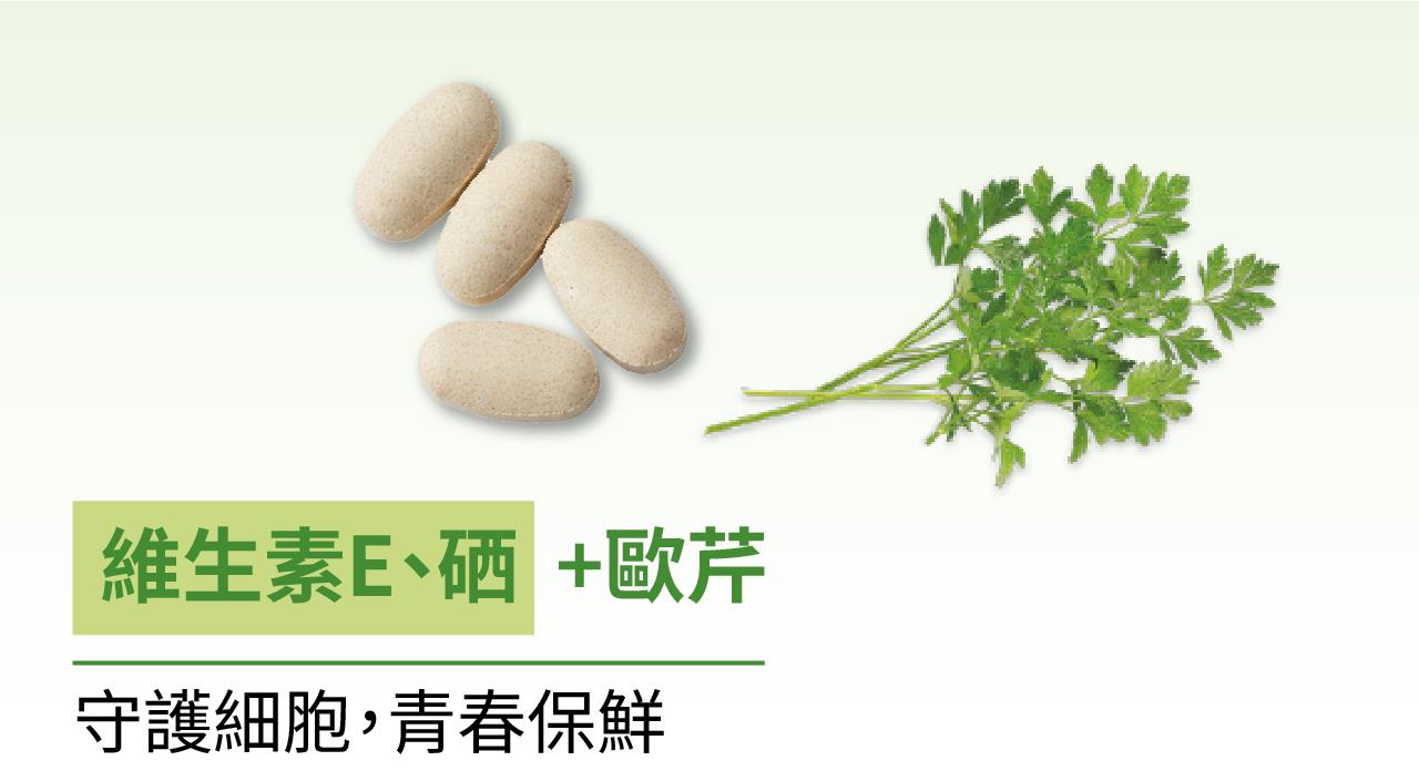 維生素E:脂溶性的維生素E有強大的抗氧化力,能保護細胞膜免受過氧化損傷,保護心血管疾病及保持靑春。硒則能與E相輔相成加強效能。