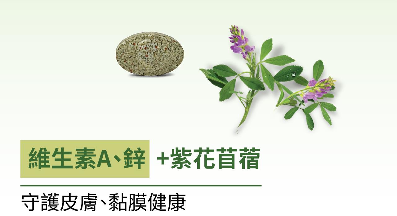 紫花苜蓿:「牧草之王」紫花苜蓿,含多種維生素、礦物質及植物營養素,能優化維生素A的利用率,支援皮膚及黏膜組織的修復與健康。