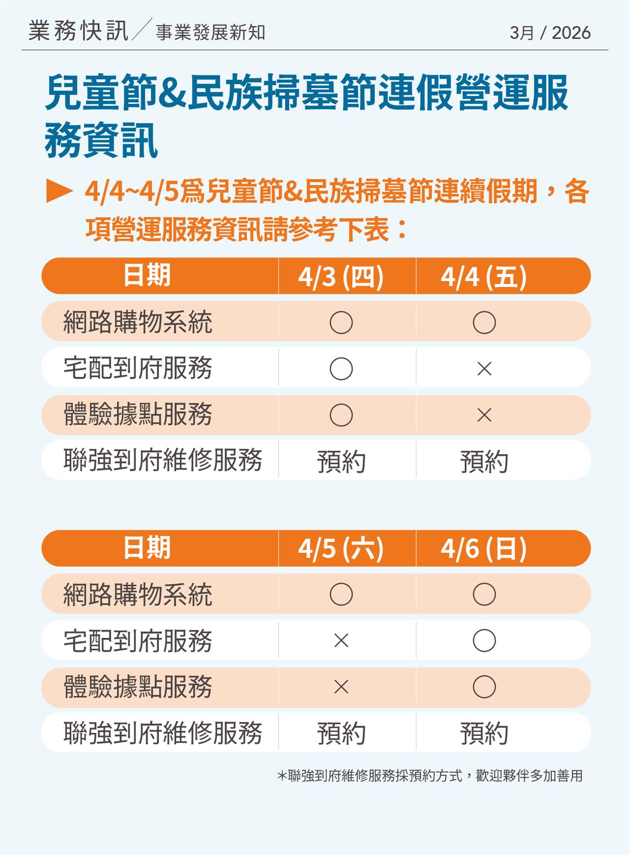 兒童節&民族掃墓節連假營運服務資訊