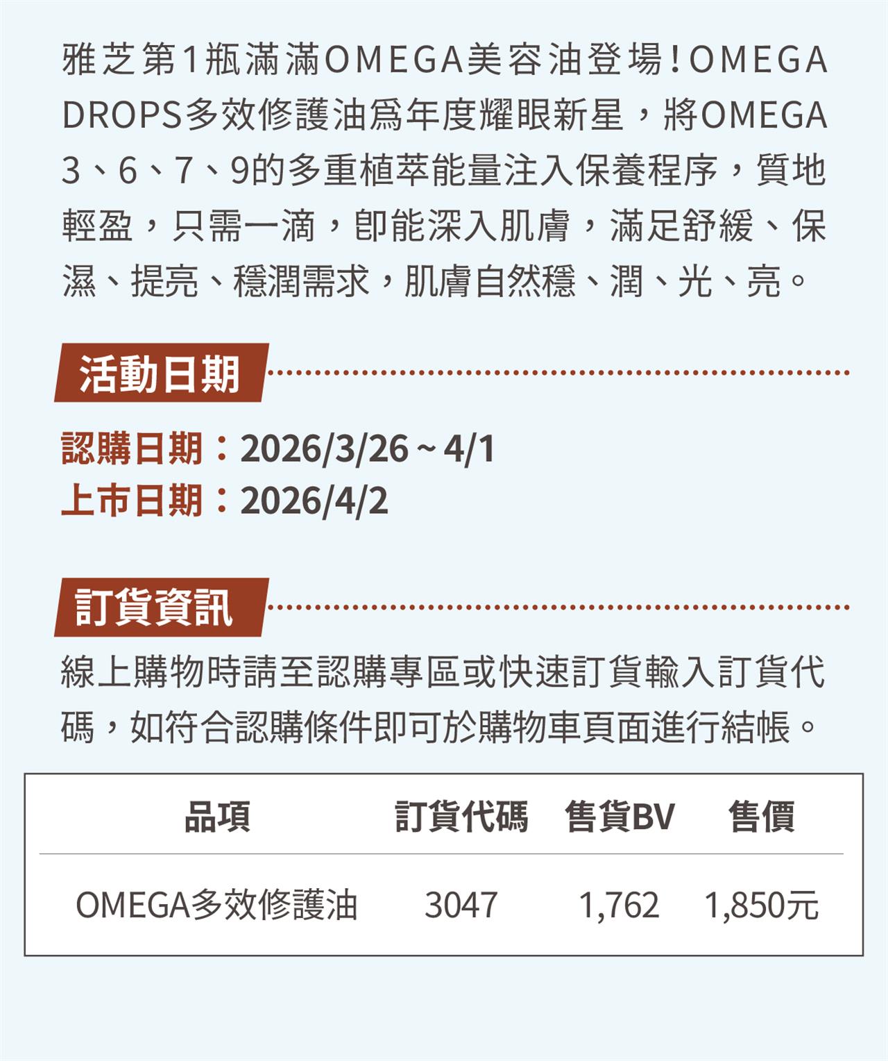 雅芝OMEGA多效修護油 4/2新品上市