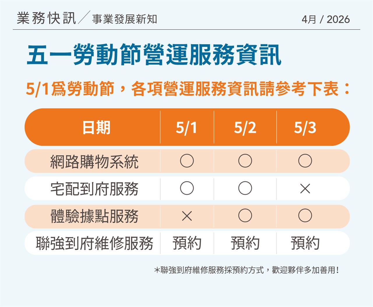 5/1 勞動節營運服務資訊