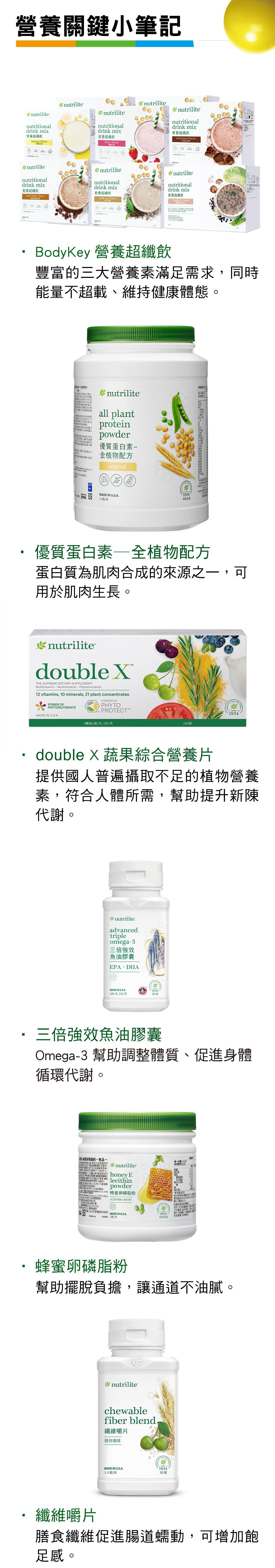 內容 BodyKey 營養超纖飲任選2 盒+ 優質蛋白素-全植物配方家庭號1 罐+double X 蔬果綜合營養片補充包1 盒+三倍強效魚油膠囊1 瓶+蜂蜜卵磷脂粉1 罐+纖維嚼片1 瓶+紐崔萊搖搖杯(蘋果綠)1 個+ 28天體驗參加卡