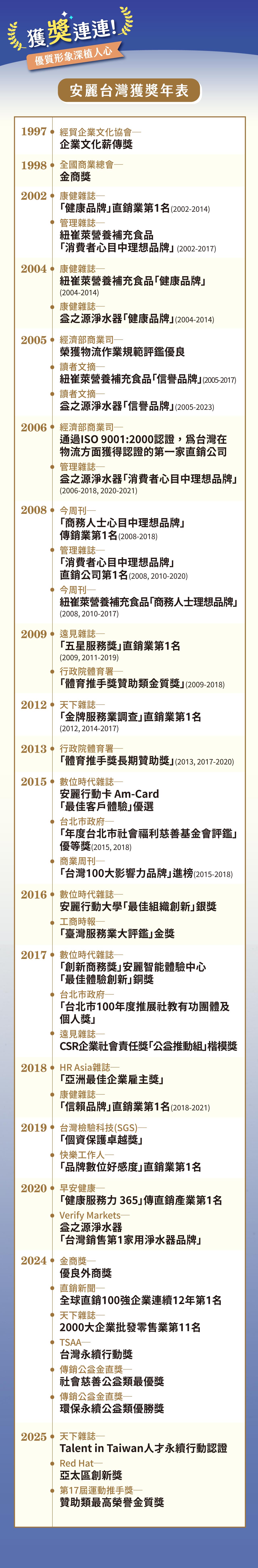 安麗憑藉誠信的企業理念、與時俱進的創新精神與對社會的承諾,在各領域屢獲殊榮,展現卓越的品牌價值。這些獎項不僅是我們的高度肯定,更突顯安麗致力於幫助人們過更好生活的企業願景!讓我們一起見證這些榮耀時刻,持續締造更多耀眼成就!