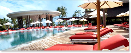 轟立於海灘與泳池畔間的360度全景式海灘景觀吧台,由法國頂尖設計大師Marc Hertrich設計打造,完美詮釋法式時尚奢華與巴里島傳統風情,在海天美景相襯之下,享用全日無限供應的精緻特調飲品與輕食點心,給您一個最時尚的假期空間;晚間時分,吧台池畔邊所提供娛樂活動及現場樂隊表演,更為假期增添多樣樂趣。您可在時尚的360度池畔
