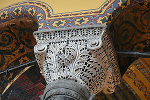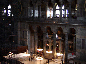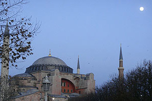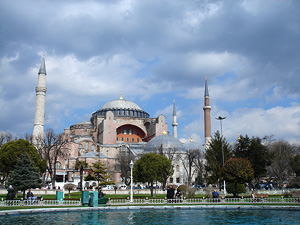 原由君士坦丁大帝於西元360年建造,位於藍色清真寺的正對面,教堂經歷多次改朝換代,原本是遵照查士丁尼大帝的命令,要建造一座全世界最大的教堂,後來鄂圖曼土耳其帝國征服君士坦丁堡,教堂被改建成伊斯蘭教清真寺,一直到土耳其共和國建立後才改為博物館。這座教堂氣勢恢弘,有直徑33公尺的巨大圓頂,104根大理石柱的柱廊,牆上基督教聖像馬賽克壁畫,散發莊嚴神聖的氣氛,不過四周又立有四根清真寺才有的尖塔,內殿還掛著巨大的可蘭經,這裡往往會令人懷疑到底是上帝還是阿拉的殿堂。不過它絕對是令人驚嘆的偉大建築。公認是拜占庭建築藝術的代表作,也被百科全書選為現代七大世界奇觀之一。