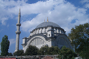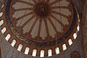 藍色清真寺其實是蘇丹阿赫美特清真寺的俗稱,於1609—1616年間由當時的蘇丹穆罕默德下令建造。由於寺內充滿藍磁磚的光彩,所以大家稱它為藍色清真寺,為土耳其最著名的清真寺之一!大圓頂加上周邊無數的小圓頂是鄂圖曼建築的特色,它也是土耳其唯一具有六根尖塔的一座清真寺(一般的清真寺大多都只有四根)。寺內以兩萬多片藍色彩釉瓷磚嵌飾,再透過正中央圓頂260扇窗戶的陽光照射,形成金藍輝映、令人屏息的景像。所有的牆上裝飾了花卉、星辰及可蘭經,寺裡的地毯是由衣索匹亞進貢的羊毛所織成,簡直是一座充滿華麗與奇幻色彩的藝術傑作。