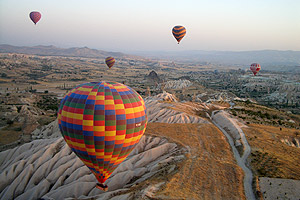 卡帕多奇亞的另一個特色是熱氣球,乘坐熱氣球,由空中俯瞰大自然是一種相當特別的感受,會讓你對眼前的自然風光讚嘆不已。隨氣球在天空時高時低,一下子在峽谷裡貼地平飛,一下子拉升至高空俯瞰峽谷的壯麗,是一種讓你無法言喻的感動。