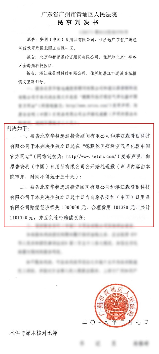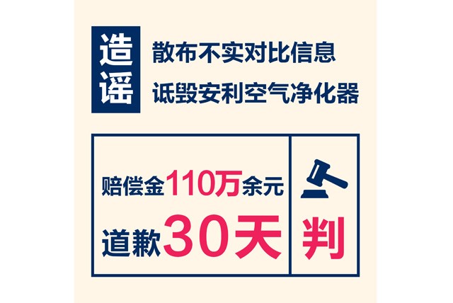 日前,廣州市黃埔區人民法院做出一審判決,北京華智遠通投資顧問有限公司和湛江森普耐科技有限公司在網上散佈、捏造安利(中國)公司生產的空氣淨化器存在二次污染、不適合嬰幼兒和易感染族群等虛假事實,損害安麗的商業信譽和商品聲譽,構成對安麗的商業詆毀,判定兩被告賠償安利(中國) 110萬餘元,並在原網站發佈聲明,並公開道歉。