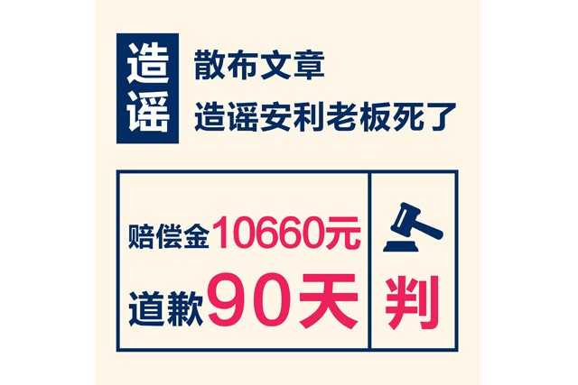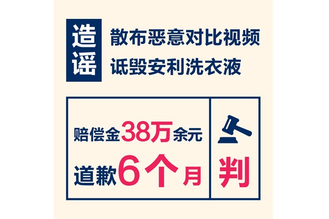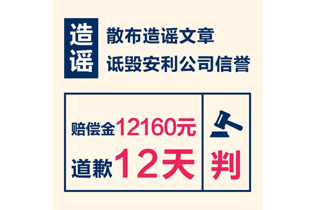 2017年2月,江蘇兩家網路科技公司,因在網路散佈安麗洗衣精對人體有害的造謠影片,構成虛假宣傳、商業詆毀等不正當競爭行為,被法院判令向安利(中國)公司支付賠償金共計38萬餘元,並在其官網及微信公眾號公開道歉6個月。