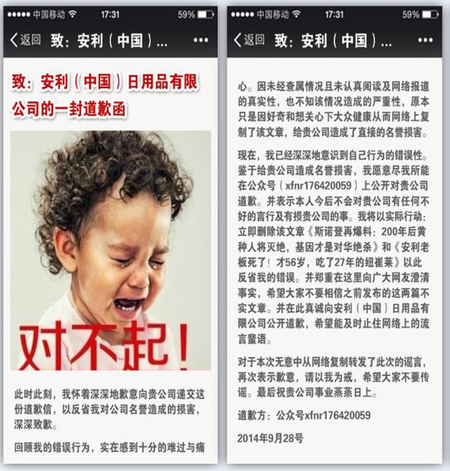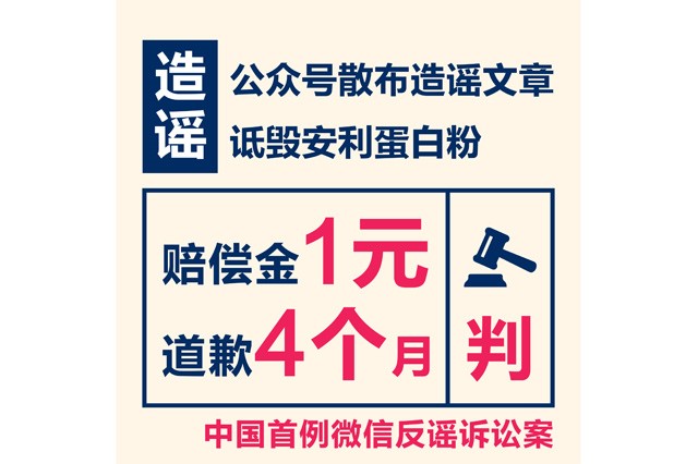 2014年,微信公眾號“幸福**”因刊登《安麗紐崔萊蛋白粉使用基改大豆》等兩篇謠言文章,其帳號運營者被安利(中國)公司告上法庭。最後,帳號運營者不僅要將謠言文章刪除,還需在其微信公眾帳號發佈道歉信4個月。此案也成為中國首起微信傳謠訴訟案,被各家媒體報導。