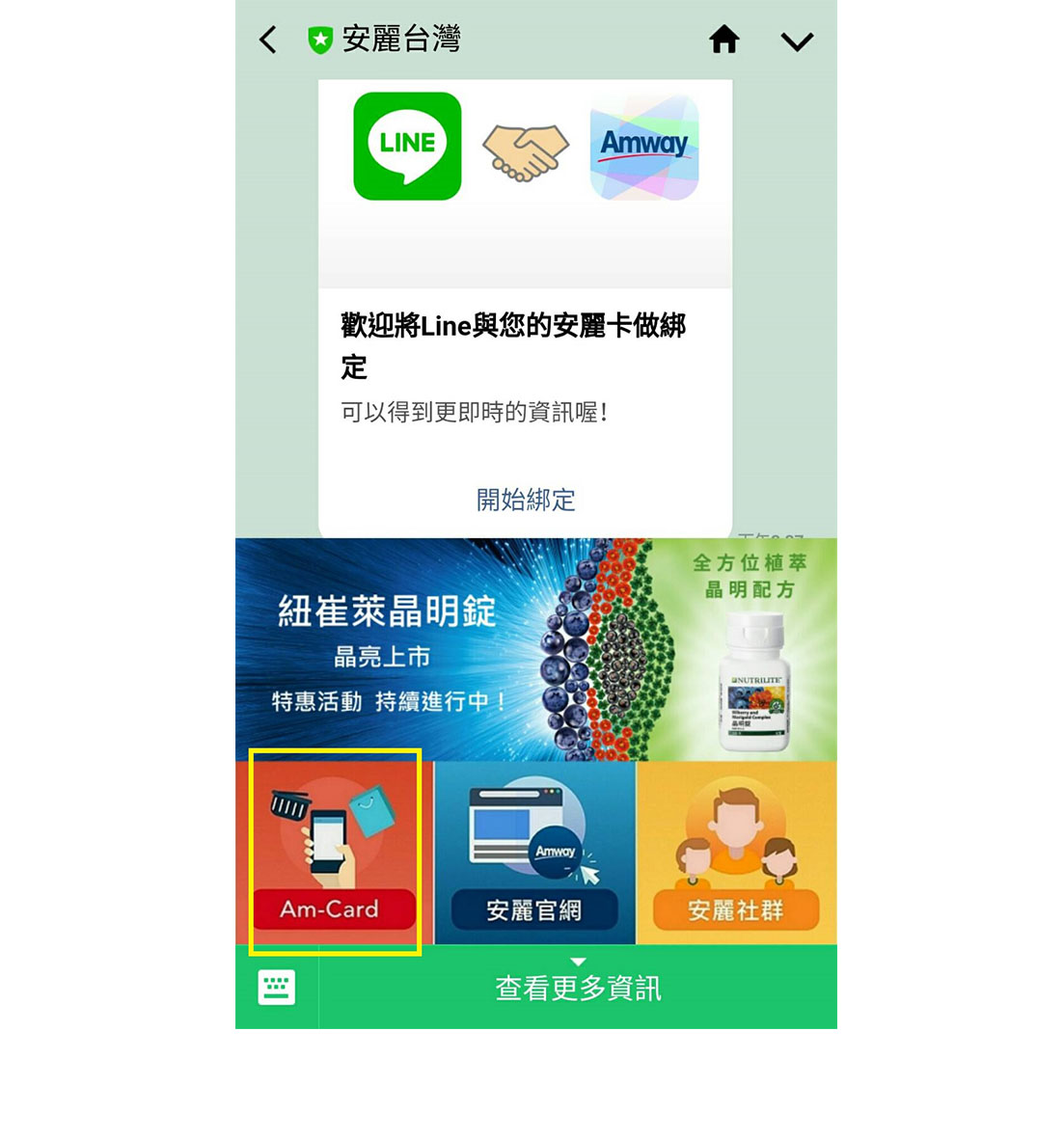 進入安麗LINE官方帳號,點擊選單中的「Am-Card」(如下黃框),即可開始綁定!
