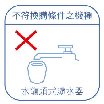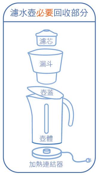 - 本次舊換新活動含濾水壺舊換新,舊機回收濾水壺須為完整結構,包含「壺體」、「壺蓋」、「漏斗」與「濾心」;隨身濾水瓶不接受舊換新;若為加熱型,必須含括「加熱連結器」, 若有缺少任一部分,則不予受理。